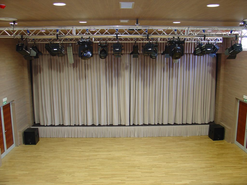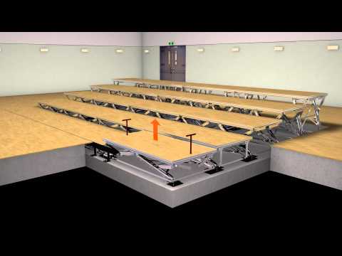 Poleg rešitve za segmentni sistem nagibnih tal smo v dvorano namestili tudi modularne enote s škarjastim sistemom nog – Airstage iz katerih je sestavljen oder. Odrske enote Airstage so fiksno vgrajene pod končno višino tal in so rešitev za hitro in enostavno preoblikovanje prireditvenega prostora. Vsaka odrska enota ima podkonstrukcijo, ki omogoča prilagajanje višine glede na preostala tla v prostoru.